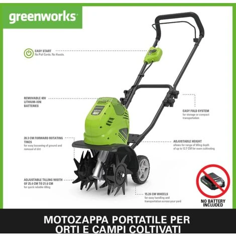 UNA BATTERIA PER TUTTI: Le nostre batterie da 40 V sono disponibili con 2 Ah 2.5 Ah 4 Ah o 6 Ah e sono compatibili con molti altri prodotti Greenworks Tools in giardino e in officina. Così si ha un raggio d’azione infinito e non si corre più il pericolo di inciampare in fastidiosi cavi durante i lavori di giardinaggio.