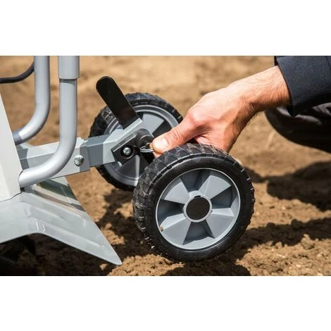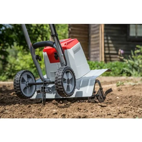 Ideale per dissodare (fresare) e lavorare il terreno e per la preparazione della semina: Zappatrice elettrica Kultivator IEM 1200 di IKRA – La potente motozappa di IKRA (1200 W) utilizza un efficiente motore elettrico da 230 V (zappatrice elettrica). Il motore garantisce emissioni acustiche molto basse durante il dissodamento della terra nel vostro giardino. Le 24 lame sulle sei zappe (rulli zappatori) garantiscono una lavorazione semplice ed efficace del terreno. Le lame penetrano autonomamente nel terreno e assicurano un movimento stabile durante la zappatura del terreno. Le lame penetrano fino a 20cm nel terreno. Grazie allo sperone di frenata regolabile in altezza (detto anche: sperone di zappatura) è possibile impostare la profondità di lavoro in modo semplice e confortevole. Lo sperone di frenata contribuisce a fare penetrare le zappe più in profondità nel terreno (impostazione e/o regolazione della profondità). Più in basso viene regolato lo sperone, più in profondità l’attrezzo scaverà nel terreno. Lo sperone aiuta quindi a determinare la profondità di lavoro durante la fresatura del terreno, ossia il dissodamento. La corretta profondità di zappatura è decisiva per un risultato ottimale. La regolazione può variare a seconda delle condizioni del terreno, ad es. argilloso o sabbioso. La larghezza di lavoro della zappa è di 40 centimetri, quindi molto ampia. La trasmissione avviene tramite un robusto ingranaggio a vite immerso in olio che non richiede manutenzione. La zappatrice elettrica (elettrozappa) è dotata di un freno elettrico di sicurezza. Questo freno garantisce lo spegnimento immediato dell’attrezzo se, ad esempio, il terreno diventa troppo duro o se dei sassi bloccano le lame. L’interruttore di sicurezza sulla sinistra della maniglia serve come blocco di accensione (blocco di sicurezza per bambini). Soltanto dopo aver azionato questo pulsante di blocco è possibile accendere l’attrezzo mediante l’interruttore di accensione. Ad esempio, se l’attrezzo si surriscalda per una sollecitazione eccessiva, il dispositivo di protezione da sovraccarico spegne automaticamente l’attrezzo per la sicurezza e la protezione del motore. Le ruote integrate di trasporto e/o di supporto sono perfettamente adatte per spostare la motozappa da un luogo di impiego all’altro. Per trasportare l’attrezzo, lo sperone viene montato in modo che le ruote si trovino in basso, così che la zappatrice possa essere movimentata. Per il lavoro, invece, lo sperone si monta in modo inverso, in modo che le ruote si trovino in alto. La maniglia di trasporto è dotata di materiale Softgrip (maniglia soft). Il materiale assicura una presa particolarmente sicura. In questo modo, le vostre mani rimangono ben salde sull’attrezzo e non rischiano di scivolare durante il lavoro. Il materiale soffice frena o impedisce anche la formazione di bolle sulle mani. La zappatrice è dotata di un utile dispositivo di scarico della trazione. In questo modo il connettore rimane fissato in modo perfetto e non perde la presa sulla rete elettrica. Il dispositivo di scarico della trazione impedisce quindi il distacco e allentamento accidentale del cavo di prolunga. Inoltre, tramite questo pratico dispositivo, il cavo viene guidato accanto al corpo e non è d’intralcio durante il lavoro. In questo modo è possibile eseguire il lavoro in giardino in modo molto confortevole e senza sforzo. Dopo il lavoro di giardinaggio è possibile depositare la motozappa semplicemente in garage o nel capanno in giardino senza ingombro. Il telaio stabile e rivestito (asta di guida) si può semplicemente e rapidamente ripiegare.