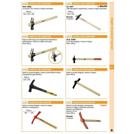 TESTA IN ACCIAIO FORGIATO E TEMPERATO, MANICO IN FRASSINO VERNICIATO. PENNA E CONTROPENNA. PESO 400 G
