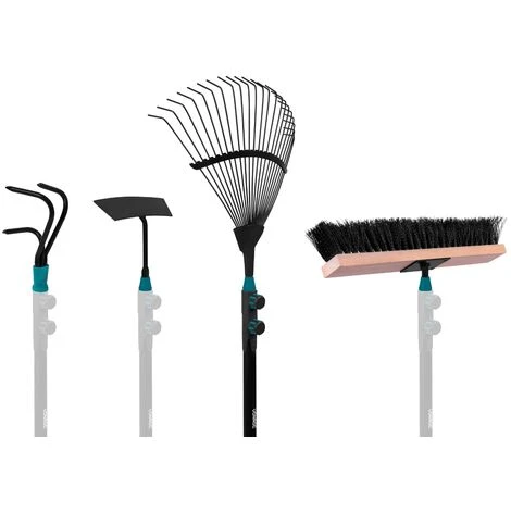 Il coltivatore serve ad allentare e arieggiare il terreno. Usa la zappa per rimuovere le erbacce poco radicate e per rompere i grumi di terra. Il rastrello raccoglie facilmente le foglie e i residui del prato. La scopa, con robusti peli artificiali, è perfetta per spazzare la sabbia e le foglie in eccesso. Tutti gli attrezzi sono realizzati in acciaio verniciato a polvere, in modo da essere ben protetti dalla corrosione. Il manico in alluminio leggero si adatta bene alla mano e ha una lunghezza confortevole (130 cm).